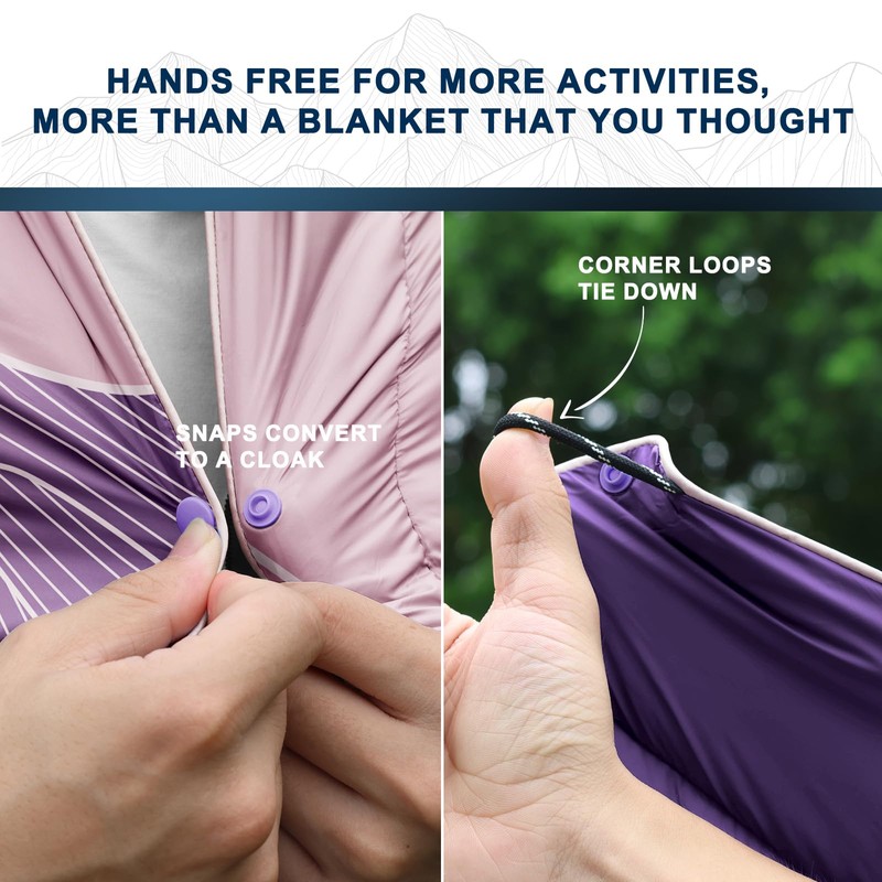 - 1.Functional Designs: The poncho snaps design could transform the puffy blanket into a cloak and make your hands available while you are drinking, eating, chatting or doing some campsite tasks and still keep you cozy. Buttoning up the snaps makes the soft blanket be a simple sleeping bag; two blankets can also be connected as a larger sleeping bag. Loops at the four corners allow you to stake the camping blanket into the ground and you can use it as a picnic mat and lie down