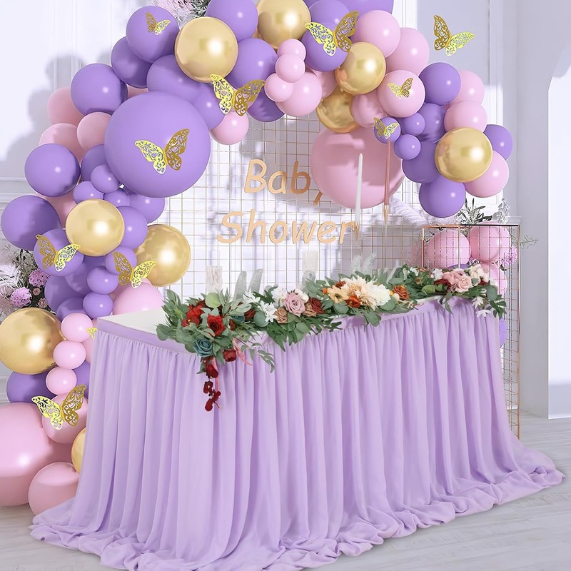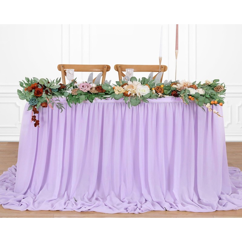 - 💡 Wedding Lavender/Light Purple Table Skirt Material: The extra long chiffon table skirt is made of Sheer Chiffon which is wrinkle-free, soft, and with a nice drapery. Table skirt both robust for kids birthday party supplies and elegant if used for wedding decoration.