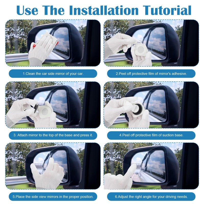 - Quick and Easy Installation: Simply clean your car’s side view mirror blindspot, attach the blind spot mirrors to the mounting bracket, and secure them in place. No tools or complicated steps required—blindspot mirrors' installation is hassle-free and takes just minutes!