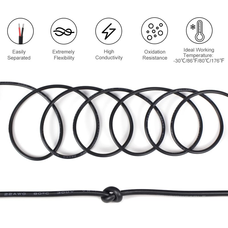 - 【High Conductivity】 22/2 gauge wire, 17 strands of tinned copper wire are inside each circuit. High precision Oxygen-free copper conducts electricity well. Compared with aluminum materials, the 22AWG wire has lower resistance and higher conductivity