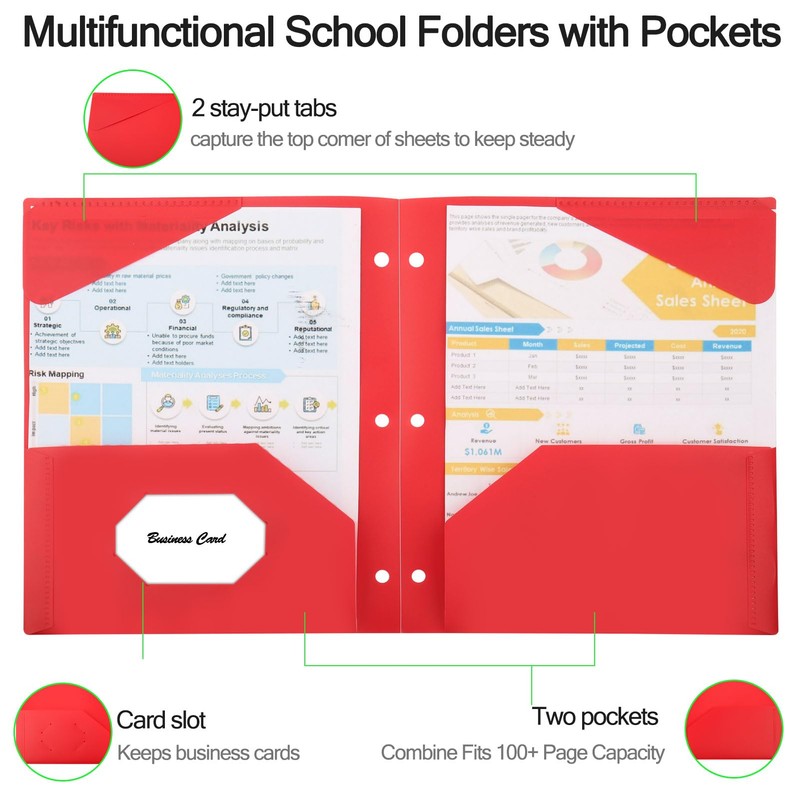- Folders with Pockets 3 Hole Punched: Each plastic folder have 2 pockets inside, 3 Hole, 1 card slots and 2 stay-put tabs for preventing the paper from falling out. Easily store your letter-sized paper documents and business cards in our standard letter-sized folders measuring 9.5”by 11.6”(closed).