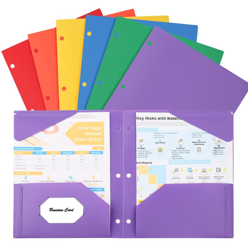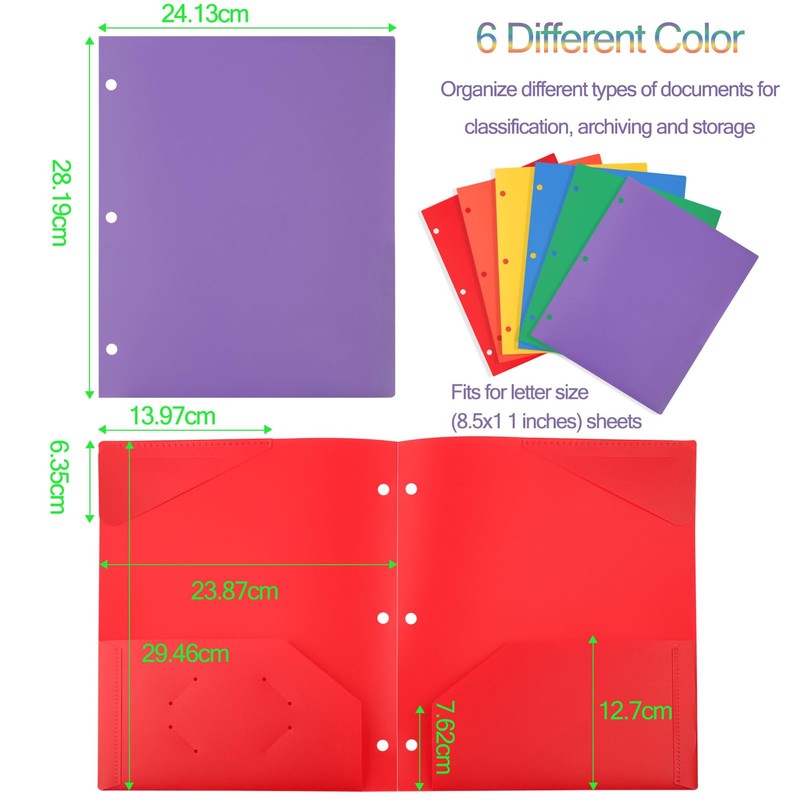 - Folders with Pockets 3 Hole Punched: Each plastic folder have 2 pockets inside, 3 Hole, 1 card slots and 2 stay-put tabs for preventing the paper from falling out. Easily store your letter-sized paper documents and business cards in our standard letter-sized folders measuring 9.5”by 11.6”(closed).