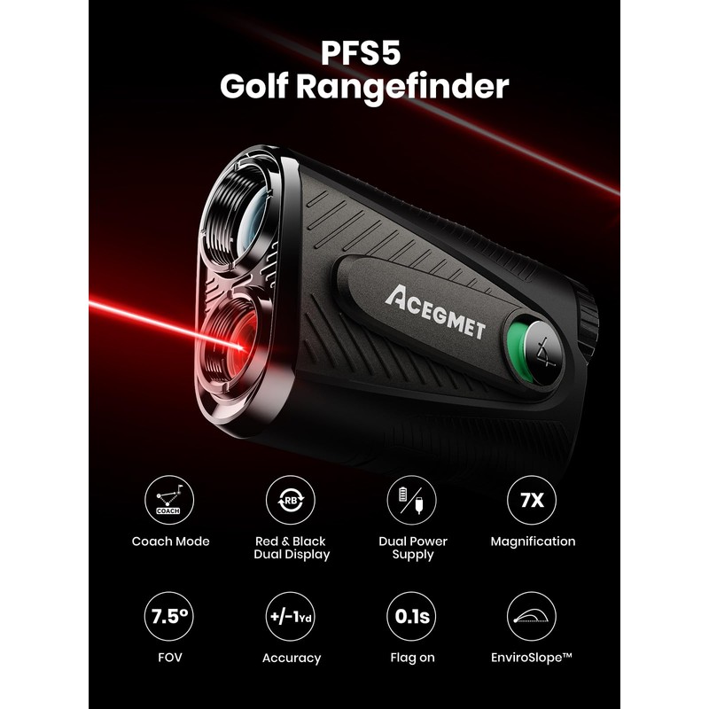 - Tour-Level Golf Rangefinder: Introducing ACEGEMT PFS5 rangefinder golf—with 1300 yards max measuring and accuracy up to +/- 1 yard, coach mode, red & black dual display, dual power supply, slope switch with EnviroSlope Tech, and magnetic mount. This accessory is suitable for golfers