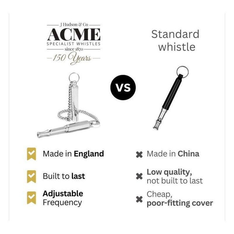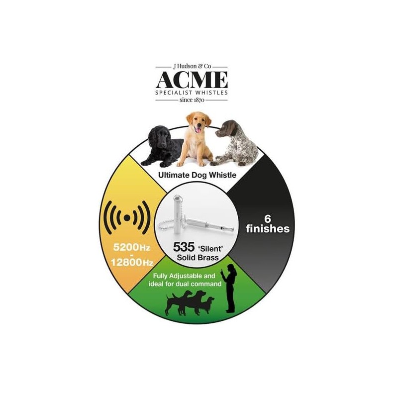 ACME original 'silent' dog training whistle no. 535. Adjustable frequency. Instruction leaflet included. Made in the UK. Good sound quality. Weather-proof. Solid brass with nickel plated finish