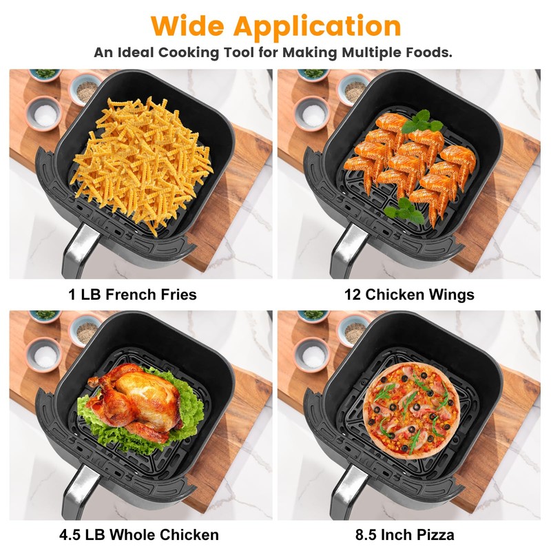 ->Food Grade Material: Enjoy healthy cooking with food grade materials,do not worry about any hazardous chemicals. ->Stainless steel and nonstick coating,durable and easy to remove food. Idea for making pizza, french fries, steak, chicken wings and fried vegetables multiple foods.easy to clean by dishwasher.meeting your air frying needs.