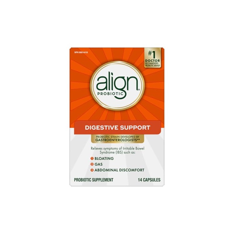 THE PROBIOTIC BRAND DOCTORS RECOMMEND MOST.? Recommended by Gastroenterologists two times more than any other probiotic brand, Align is the #1 doctor and gastroenterologist recommended probiotic brand?. When taken daily, Align Probiotic Digestive Support helps relieve symptoms of Irritable Bowel Syndrome (IBS) such as: bloating, gas, and abdominal discomfort by providing live bacteria that contributes to a natural, healthy gut flora. Align Probiotic Digestive Support is vegetarian, gluten-free, and does not require refrigeration. ?Among Doctors and Gastroenterologists who recommended a brand of probiotic in ProVoice 2023 survey.
