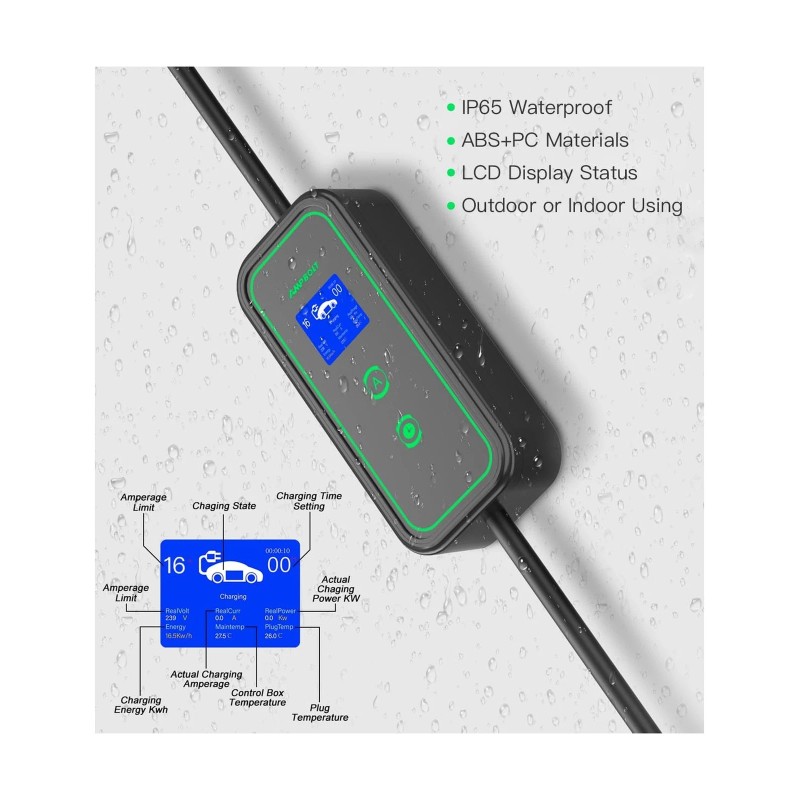 - SAFE & RELIABLE:The Portable EV Charger Level 2 is with an IP65 waterproof rating, it can withstand various weather conditions. Whether it's rain, snow, or dust, this electric car charger can still provide leakage protection, flame retardant protection, lightning protection, short circuit protection, etc, providing stable charging performance even in harsh environments both indoor and outdoor