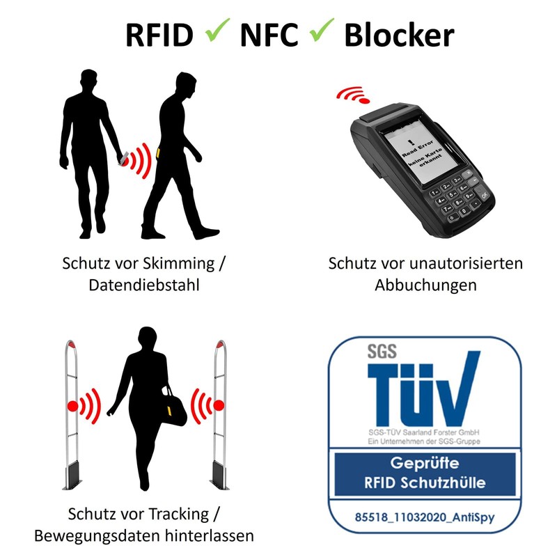 - Protects: RFID & NFC cards and ID cards from reading your data via radio (skimming). Pay safely contactless.