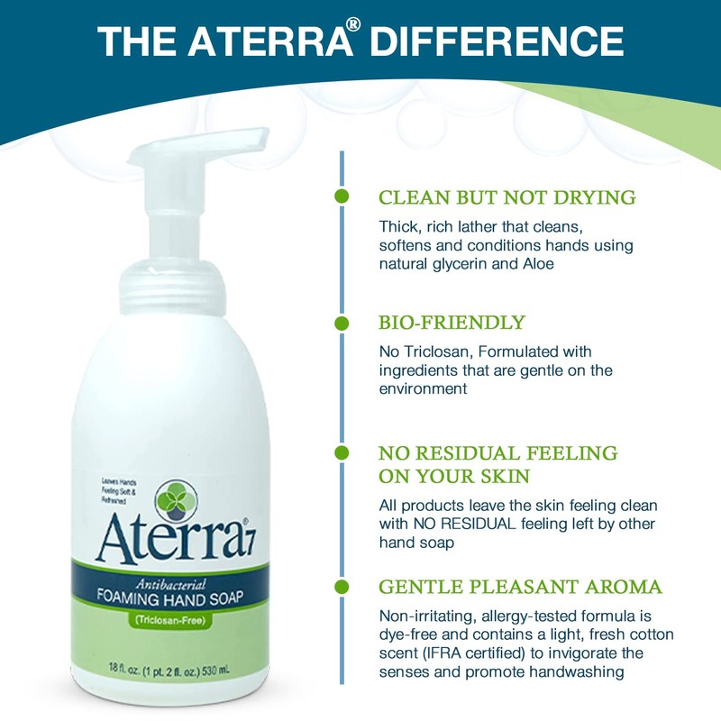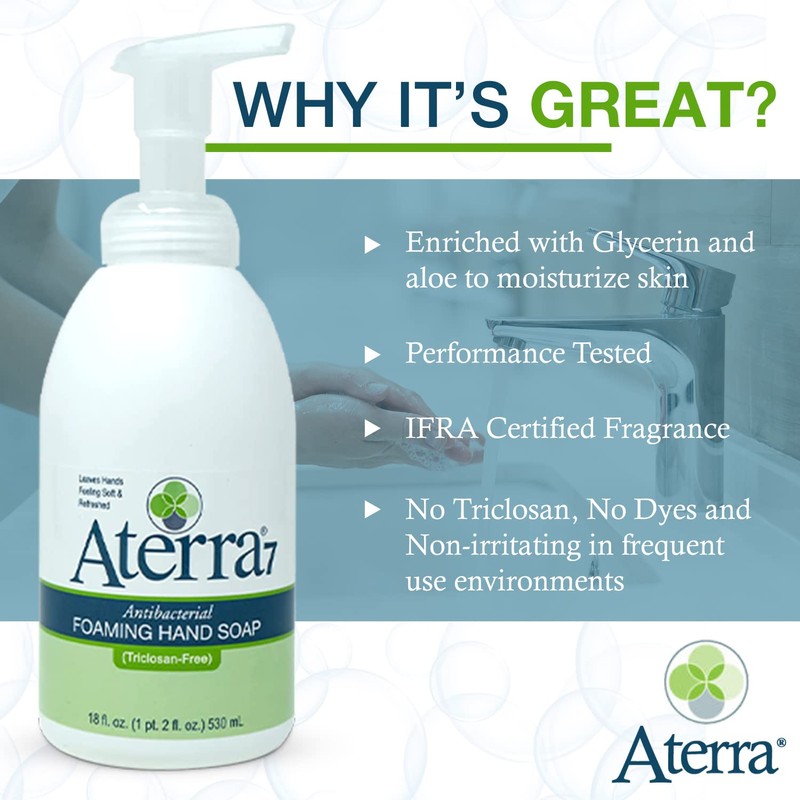 - THICK, RICH LATHER: Aterra 7 Antibacterial Foaming Hand Soap is an excellent hand cleaner with strong antibacterial activity and an ultra-soft feel. Ideal for frequent use environments.