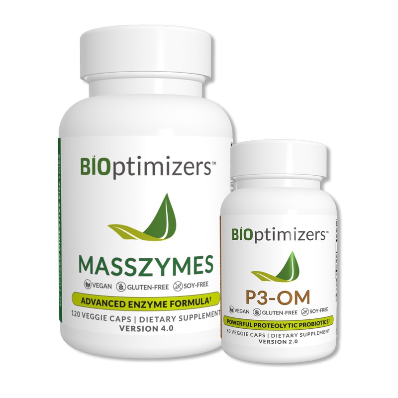 BiOptimizers MassZymes Digestive Enzymes (120 Capsules) and P3-OM Probiotic & Prebiotic (60 Capsules) Supplement Bundle