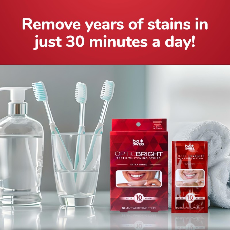- ACHIEVE A DAZZLING SMILE: Easily remove stains for a brighter smile with BioSwiss Optic Bright Teeth Whitening Strips! Perfect for making a great first impression and boosting your confidence, our whitening strips remove years of stains in just 30 minutes a day, and achieve professional-level teeth whitening results