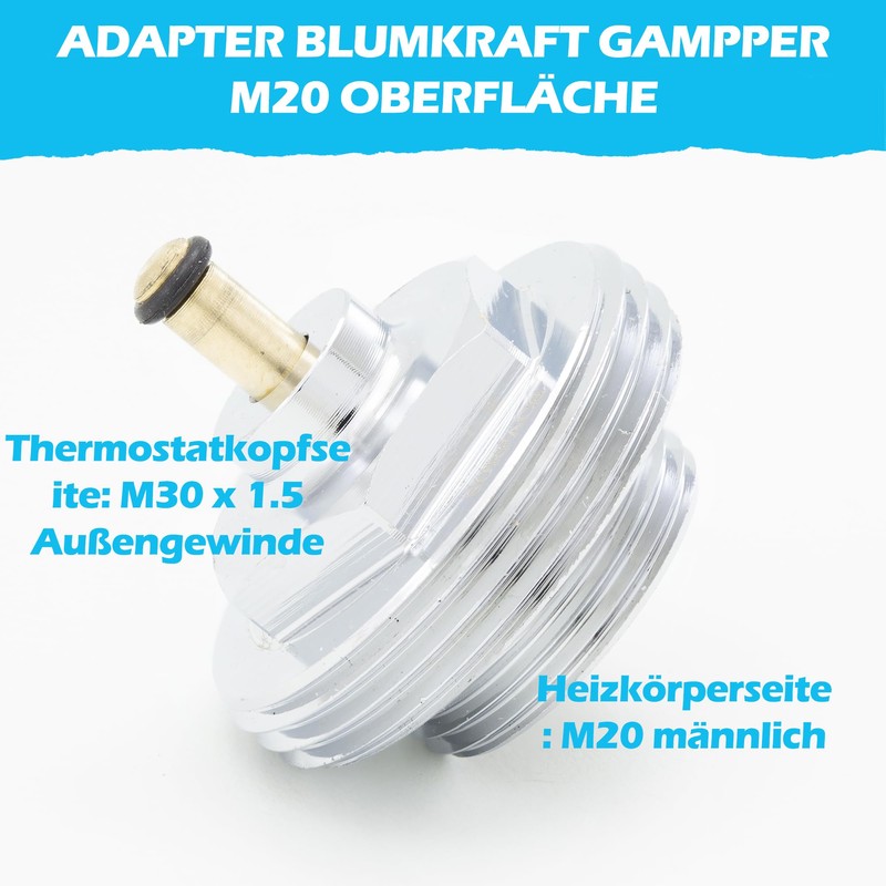 BLUMKRAFT adapter metal radiator compatible with M20 GAMPPER SURFACE to M30 x 1.5 for thermostat / thermostat head M30 x 1.5: our metal adapter fits your radiator valve to modern and intelligent thermostats in M30.