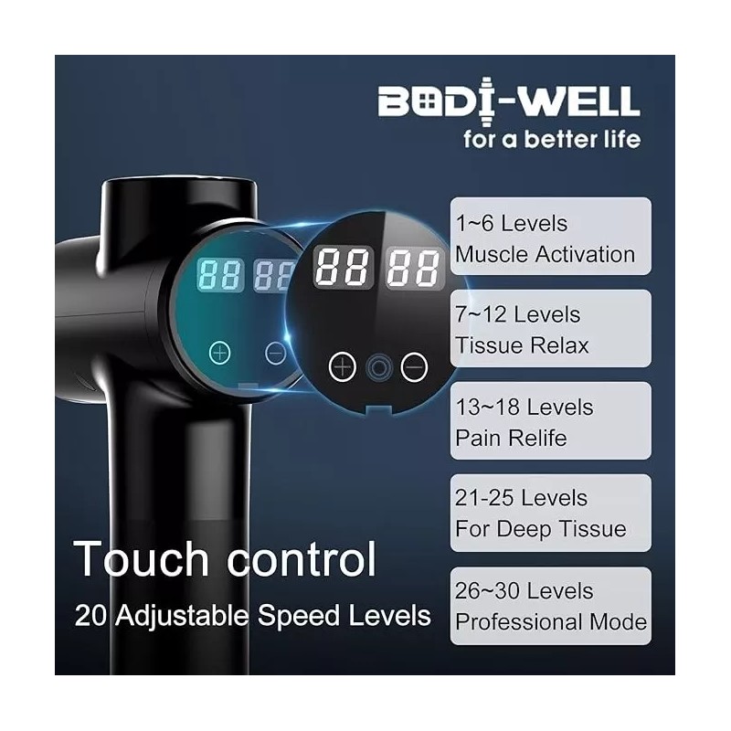 - [ High Torque BrushLess Moter ] Bodi-well M69 Massage gun equipped with a new generation BrushLess Moter witch provide POWERFUL Massage Performance.