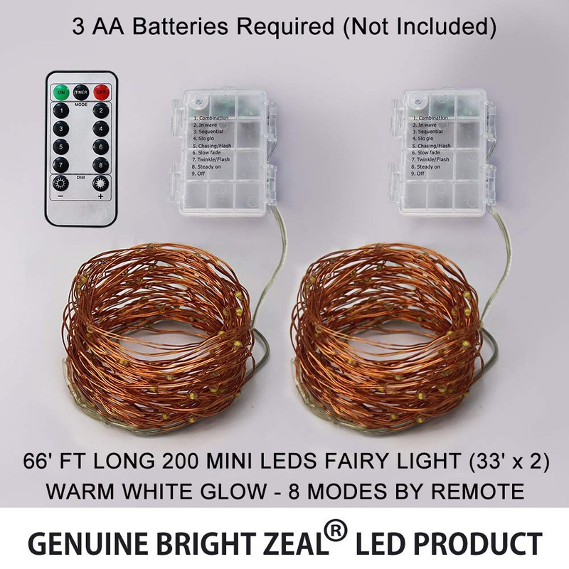 - 66 FT 200 LED MULTIFUNCTION WARM WHITE CHRISTMAS FAIRY LIGHT - This 66' Ft battery operated Christmas light consists of ONE remote and 4 pack fairy lights, each lined up with 50 delicate mini-crystal LEDs - WARM WHITE Glow and COPPER COLOR wire bring out a warm fairy feel - The copper wire can be bent into any shape for DIY purposes - The REMOTE controls 8 lighting modes, 6hr timer, brightness - Make Your Christmas Outstanding From Others With This Elegant Multifunction Fairy Light.