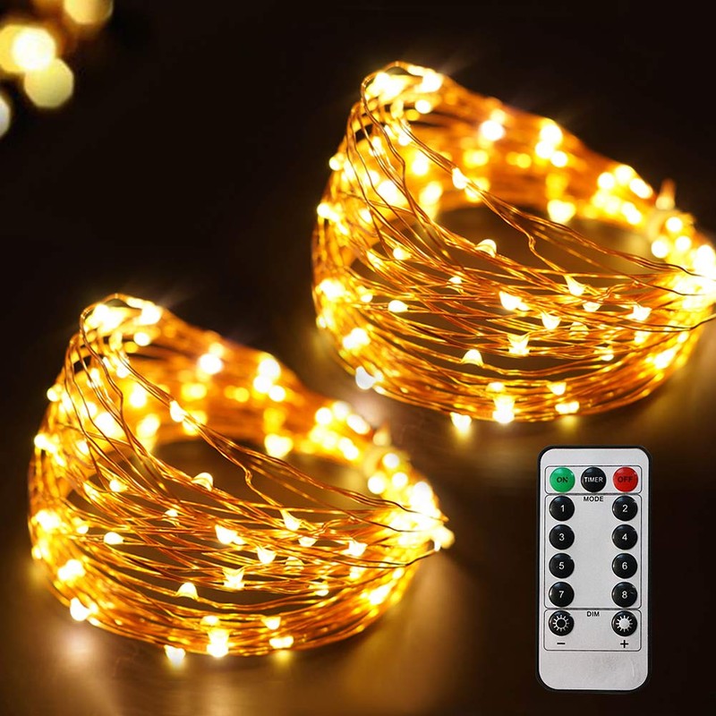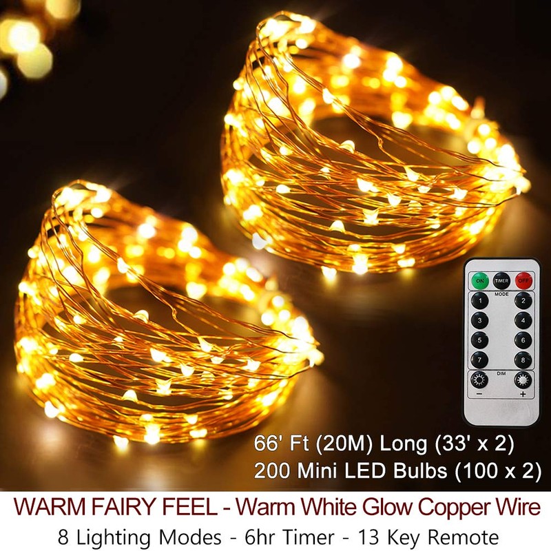 **66 FT 200 LED MULTIFUNCTION WARM WHITE CHRISTMAS FAIRY LIGHT** 1\. This 66' Ft battery operated Christmas light consists of ONE remote and TWO (2) 33' Ft fairy lights, each lined up with 100 delicate mini-crystal LEDs. 2\. WARM WHITE Glow and COPPER COLOR wire bring out a warm fairy feel. The copper wire can be bent into any shape for DIY purposes. 3\. The REMOTE controls 8 lighting modes, 6hr timer, brightness. 4\. Make Your Christmas Outstanding From Others With This Elegant Multifunction Fairy Light. **8 POPULAR LIGHTING MODES BY REMOTE OR CONTROLLER** 1\. Set the lighting mode and the brightness by remote from EIGHT (8) popular options: Combination, In-wave, Sequential-on, Slo-glo, Chasing/Flash, Slow- fade, Twinkle/Flash, Steady-on. 2\. Mode can also be set by the controller button on the battery case. Bendable copper wire and controllable lighting mode and brightness make indoor outdoor decoration possibilities endless, day & night. 3\. Take Your Holiday Light Show To The Next Level. **WATERPROOF & 6HR TIMER** 1\. The copper wire and the mini LED bulbs are waterproof for outdoor and indoor decorations. Waterproof compact battery box is not really noticeable and easy to decorate. 2\. A 6/18 hours timer can be turned on by remote, allowing to set the light for an automatic glow every day at the same time. 3\. Ideal for Christmas, holidays, bedroom, wedding, party, shows, special events, etc. **ENERGY SAVING & EASY TO INSTALL** 1\. Long lasting LED bulbs stay cool to touch after long-time use. 2\. For a new set of batteries, the product lifespan is about 2-3 weeks with the timer on, long enough for the whole Christmas season. 3\. No wiring required, fast and easy to install. No more tangled mess of cords or searching for an outlet. 4\. Orderly wrapped around a cardboard, convenient for reuse and storage. Comes in a cardboard box, ready for gift giving.
