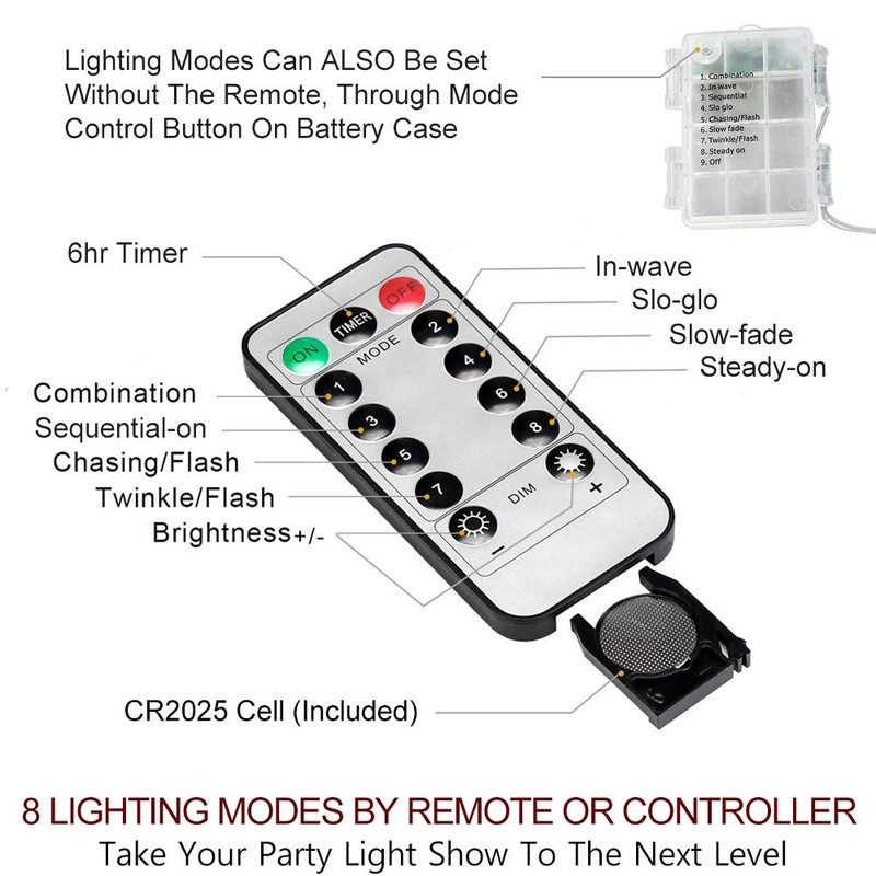 - 8 POPULAR LIGHTING MODES BY REMOTE OR CONTROLLER - Set the lighting mode and the brightness by remote from EIGHT (8) popular options: Combination, In-wave, Sequential-on, Slo-glo, Chasing/Flash, Slow-fade, Twinkle/Flash, Steady-on - Mode can also be set by the controller button on the battery case - Bendable copper wire and controllable lighting mode and brightness make indoor outdoor decoration possibilities endless, day & night - Take Your Holiday Light Show To The Next Level.