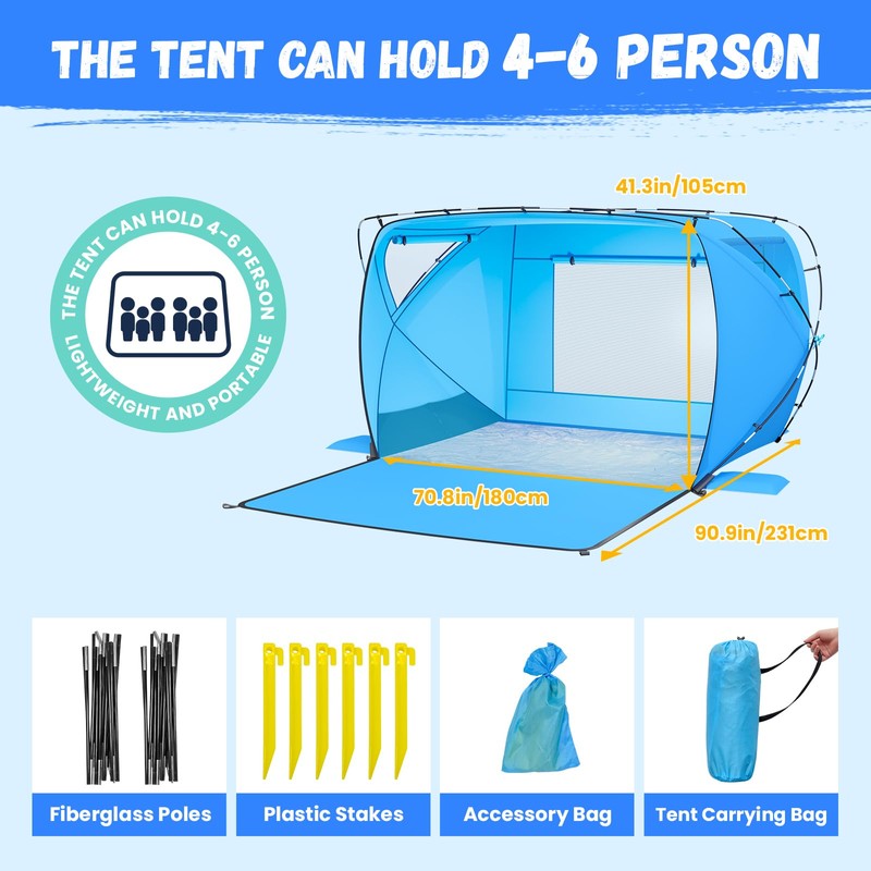 - Extra Large Space with Privacy Option: Caflix beach tent offers a generous 90.9"L x 70.8"W x 41.3"H space, perfect for 4-6 people or families. Zippable floor mat and mesh windows protects your privacy such as when changing swimming suits, clothes,or breastfeeding etc.