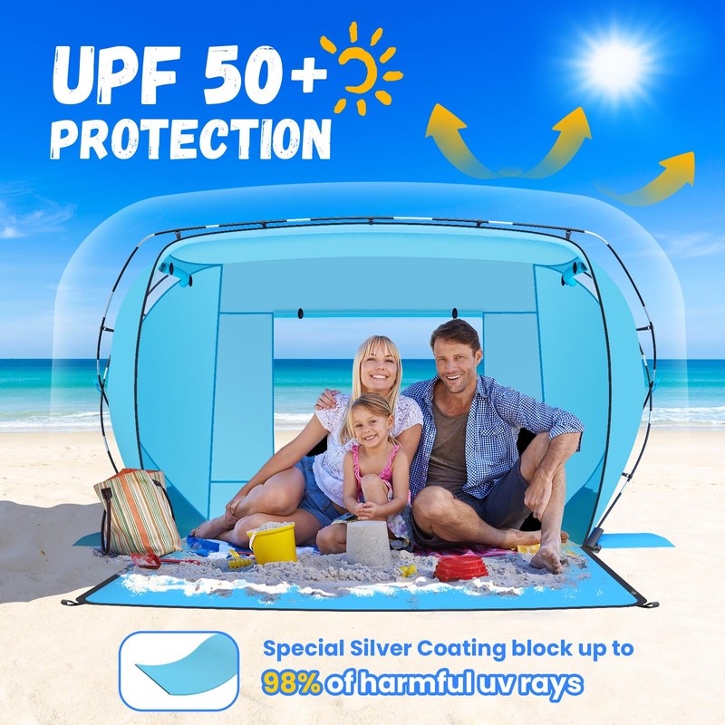 - UPF 50+ Sun Protection & Ventilation: The beach shade features fresh fabric with a unique silver coating. As this material blocks out 98% of harsh sun rays, and 3 mesh windows ensure optimal air circulation, let you enjoy the cool comfort without worrying about sunburn.