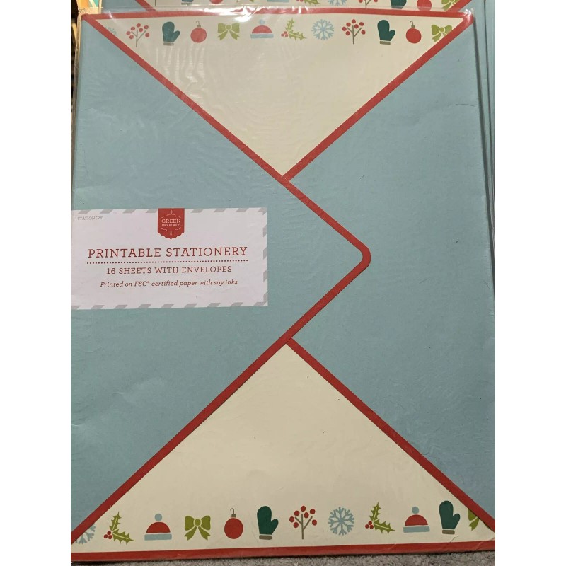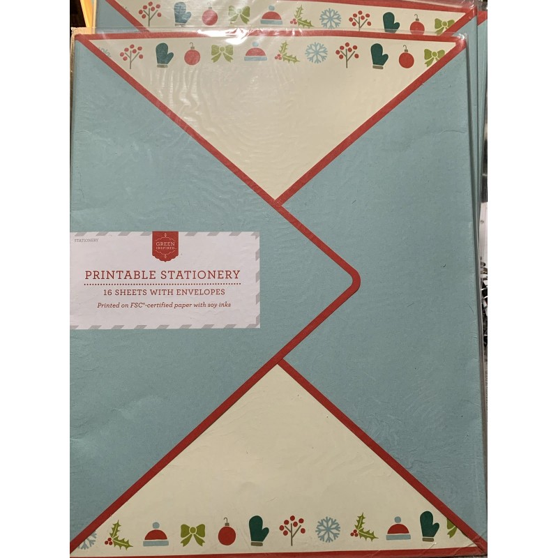 The product is Christmas-themed holiday stationery designed for use with a computer printer. It includes 16 sheets that measure approximately 11x9 inches and matching envelopes. The stationery is adorned with festive designs perfect for sending out holiday letters, invitations, or other correspondence during the Christmas season. Ideal for adding a touch of seasonal cheer to your printed communications, these paper sheets and envelopes are a practical and decorative addition to your stationery collection. Also they’re printed with soy inks on FSC certified paper.