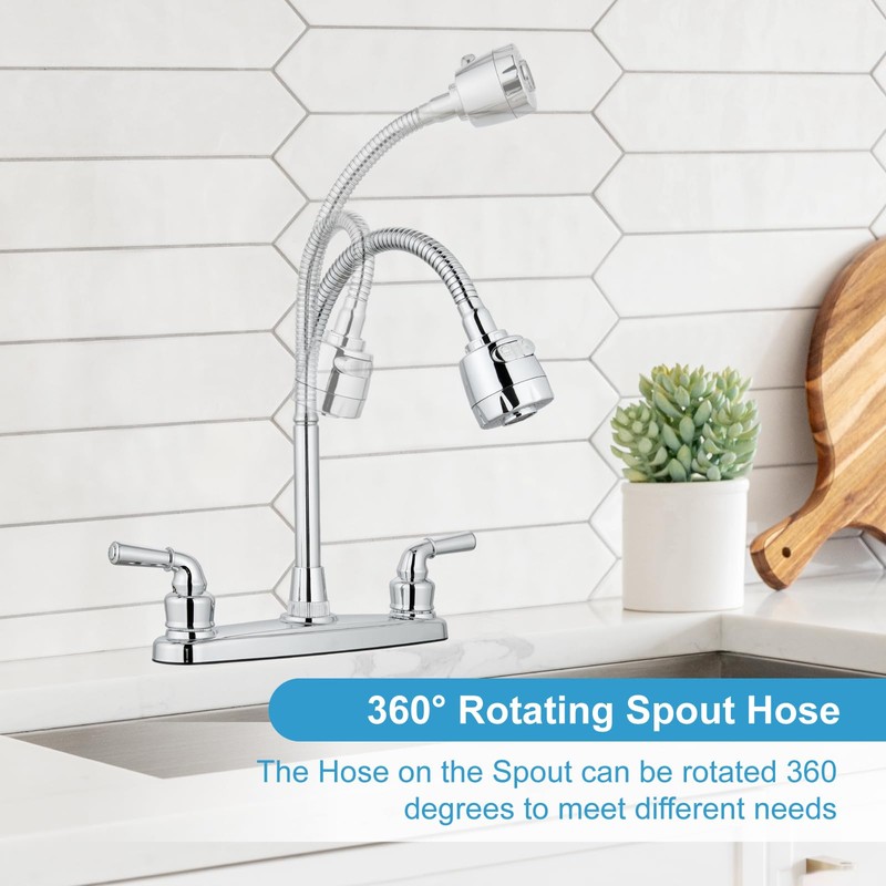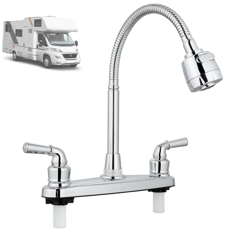 Product Description:This RV kitchen faucet features a high arc 360° swivel sprayer design that provides a larger cleaning area, allowing you to reach every corner of your basin with ease. Installation is very simple as this RV sink faucet is designed for 2-hole or 3-hole sinks with a hole spacing of 8 inches. It can even be a replacement for RVs, travel trailers, and campers. This cinwiny 3-hole sink kitchen faucet will add a stylish touch to your kitchen.