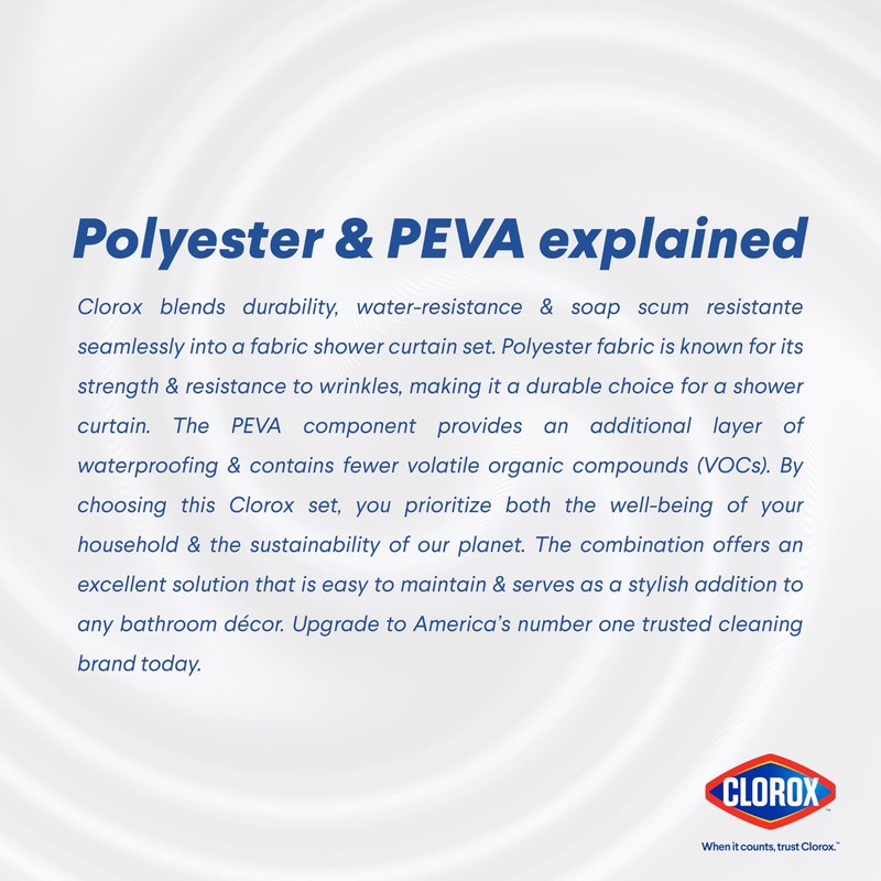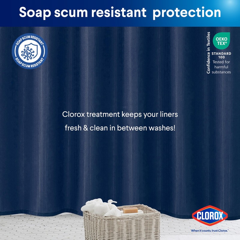 - QUALITY FABRIC: Designed in versatile blue, this shower curtain is made with 100% polyester and treated with a Clorox agent designed to repel moisture and stains and stand up to daily use.