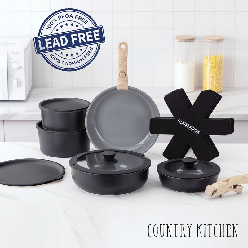 Country Kitchen 16 Piece Pots and Pans Set - Safe Nonstick Ceramic Coating Kitchen Cookware with Soft Touch Wooden Removable Handle, RV Cookware Set, Oven Safe (Black/Grey)