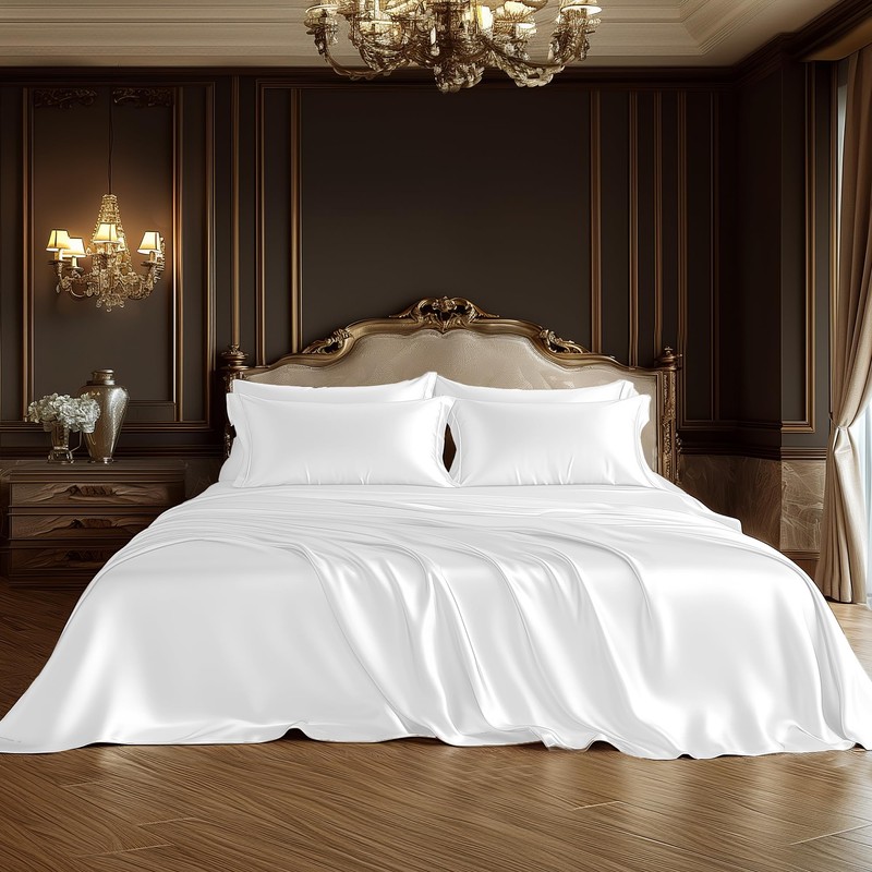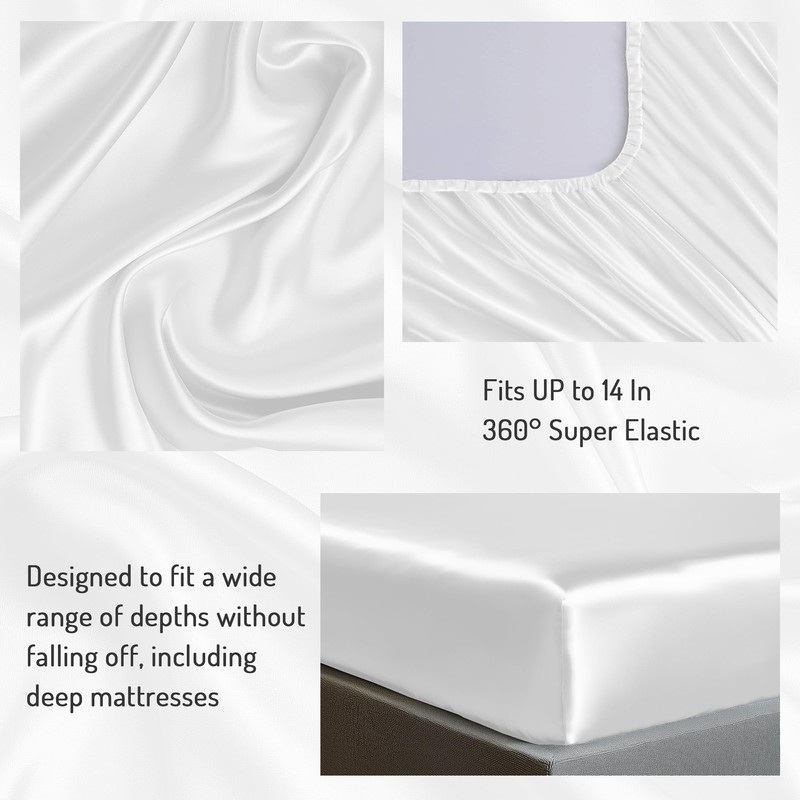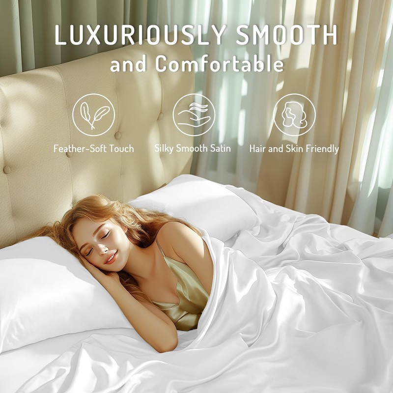 - ELEGANT WHITE FINISH: Transform your bedroom with the sophisticated elegance of pristine white satin sheets. The timeless color adds a touch of sophistication while effortlessly complementing any home decor style.