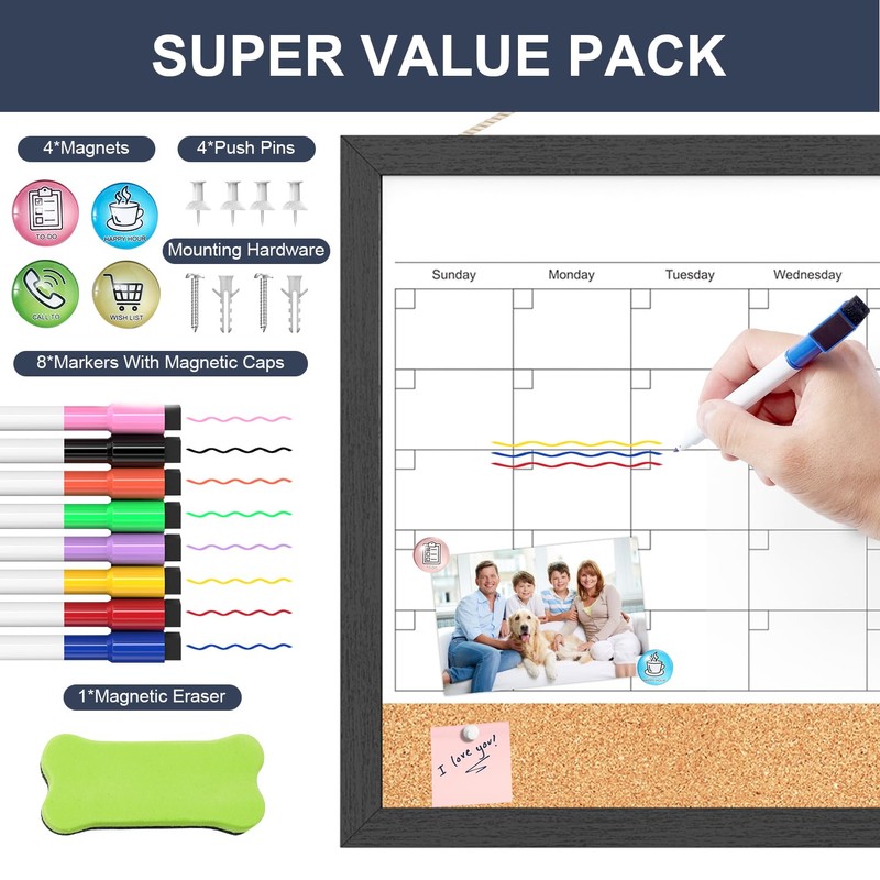 - CONTAINS EVERYTHING YOU NEED TO GET STARTED - This white board calendar dry erase set includes a 17x13 inch presentation board, 8 markers, 4 push pins, 4 magnets and 1 eraser. Enjoy the dry erase calendar and cork board combo as soon as you receive it!