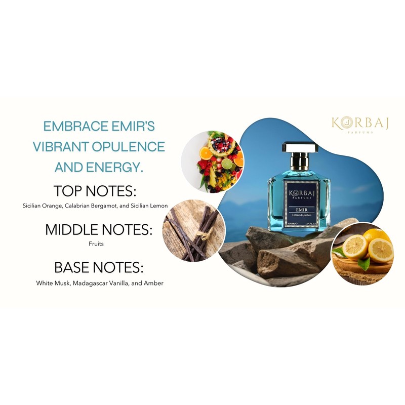 - Artisanal Craftsmanship: Each KORBAJ PARFUMS fragrance, including Emir, is a harmonious blend of the finest ingredients and skilled craftsmanship, offering a unique and sophisticated scent experience.