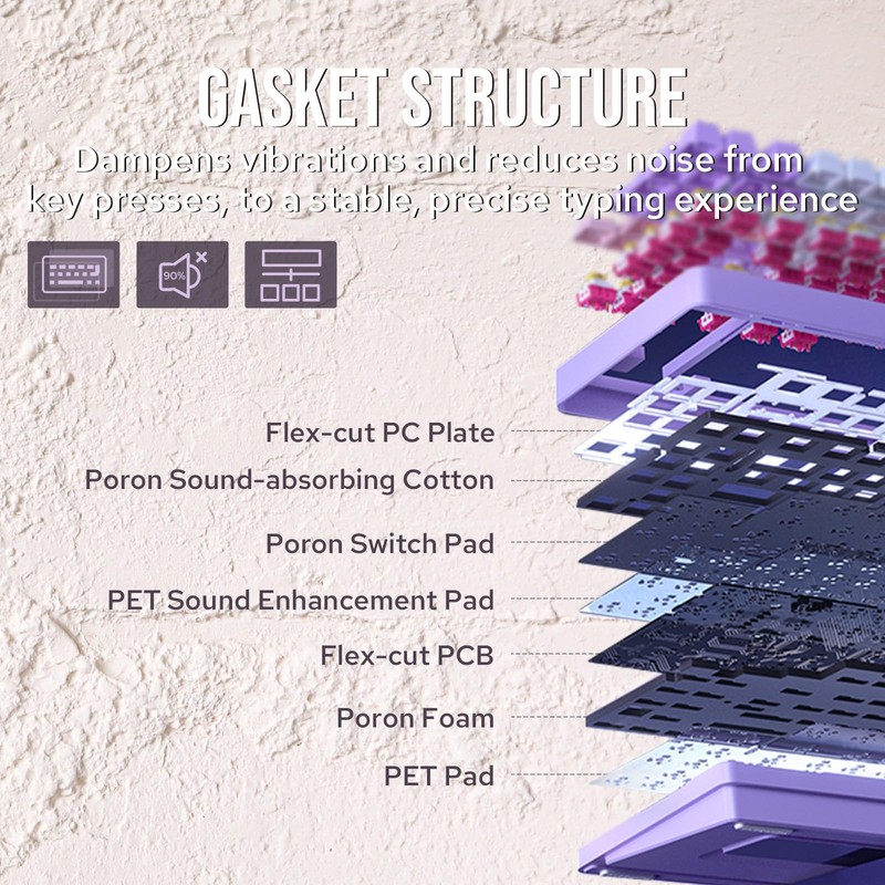 - Gasket Mount with 5 Layers of Sound & Feel Enhancing Materials: Equipped with a gasket mount structure and a flex-cut PC plate, the Hi86 delivers a soft, flexible typing experience. The keyboard includes five layers of sound and feel-enhancing materials—Poron sandwich foam, Poron switch foam, PET film, Poron bottom foam, and another PET film layer. This combination helps eliminate hollow keystrokes, reduces unwanted noise, and softens the bottom-out feel, providing a more refined and pleasant typing experience