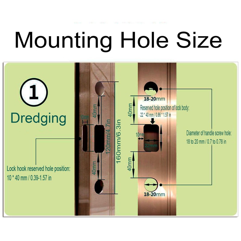 - Patio Door Handle Size(L x W): About 168 x 77 mm / 6.61 x 3.03 inch,Mounting hole centre distance: About 140 mm/5.51 inch,Locking latch Center distance: About 12 mm / 0.5 inch