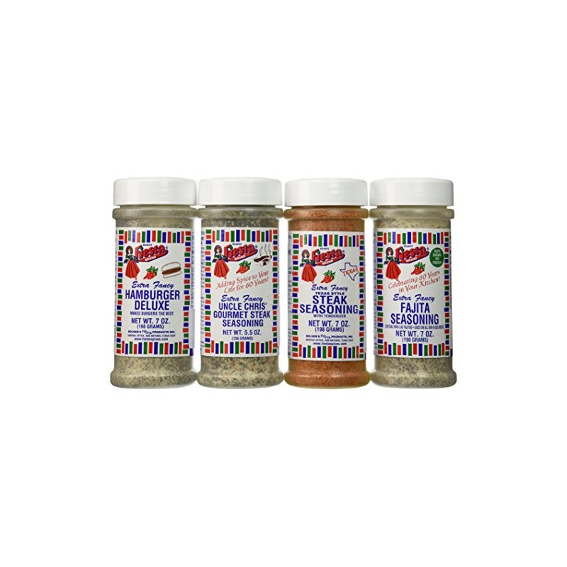 Bolner's Fiesta Extra Fancy Texas Barbeque Seasoning 4 Flavor Variety Bundle, (1) each: Texas Style Steak, Uncle Chris' Gourmet Steak, Hamburger Deluxe, and Fajita Seasoning, 5.5-7 Oz. Ea