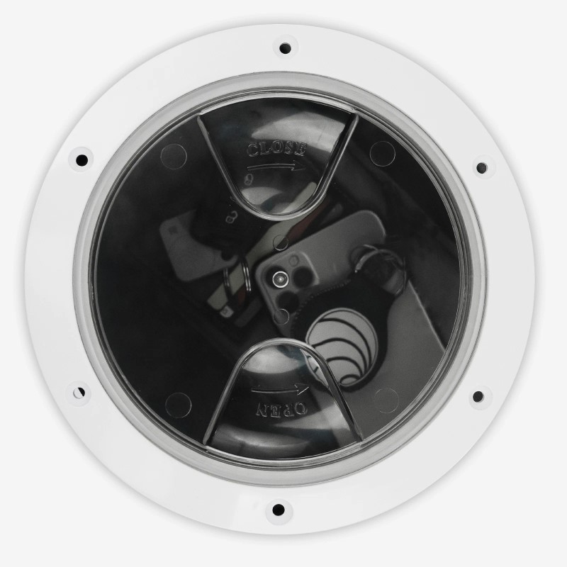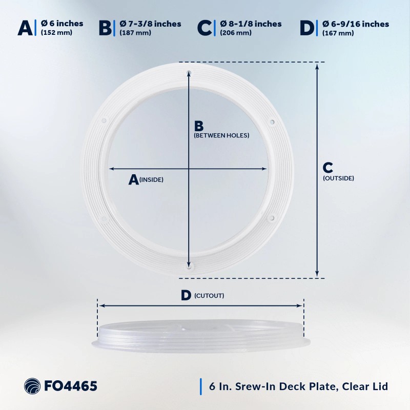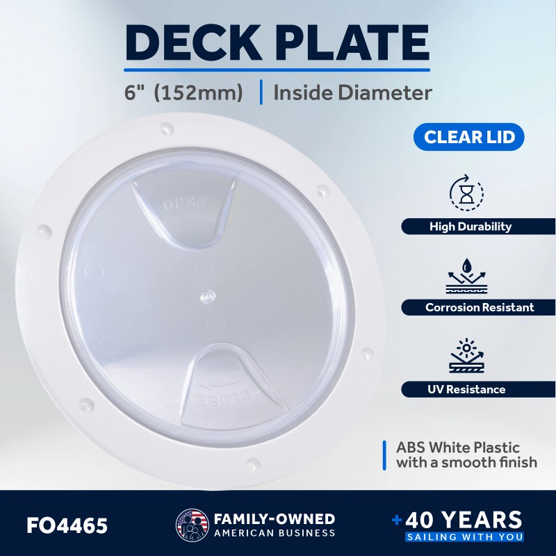 descriptionMARINE-GRADE MATERIAL: 6" Boat Hatch Round Inspection screw-in deck plate with Clear Lid is made of anti-aging, anti-corrosive, and UV-resistant ABS white plastic with a smooth finish.