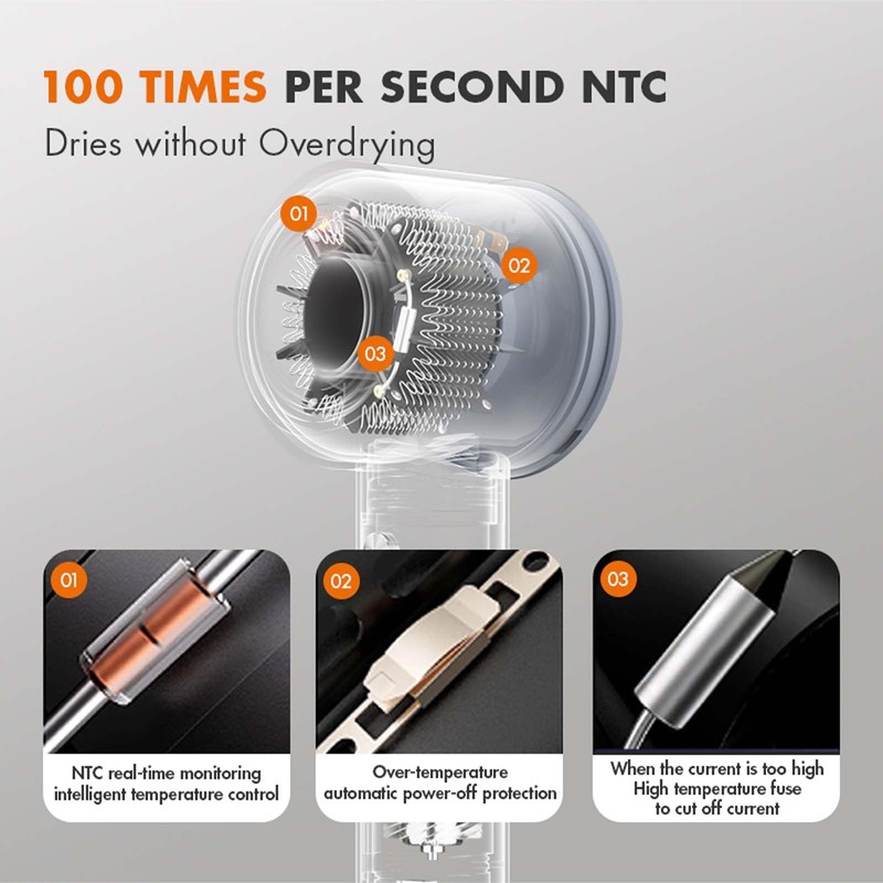 - High Speed motor:Our hair dryer is equipped with 130000RPM high speed brushless motor, privides a strong wind speed reaches 64m/s,which can quickly dry your hair in 1-4 minutes.Keeping your hair free from frizz and head damage.