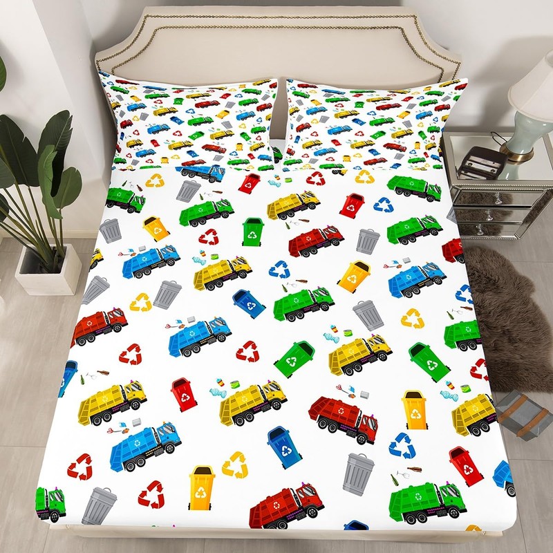 Garbage Truck Kids Sheet Twin Size,Cartoon Trash Truck Transport Vehicles Bedding Set,Boys Girls Adults Room Decor,Trash Can Chic Colorful Bright Bed Sheet Set 3pcs(Fitted + Flat + 1 Pillowcase)