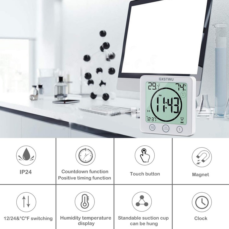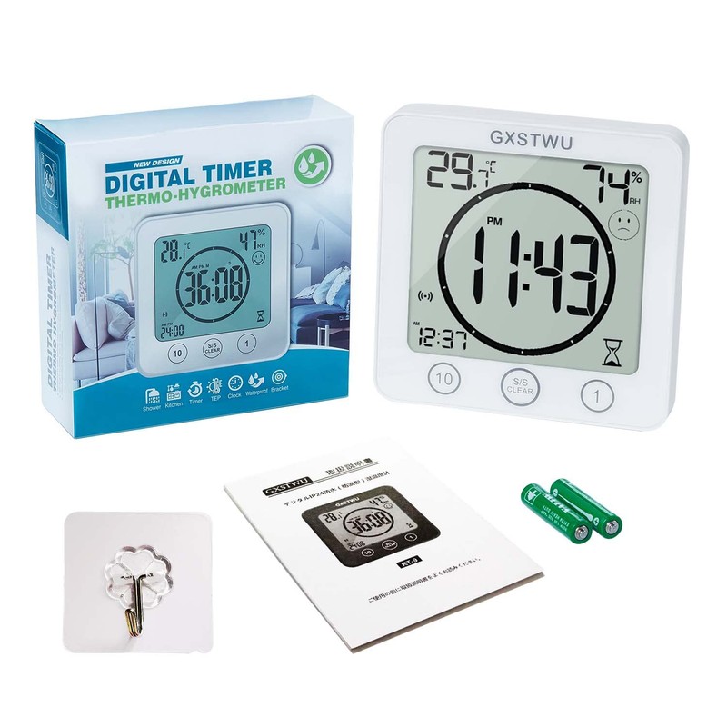 - 【Waterproof for Water Spray】Level IP24 waterproof and dustproof. Can withstand the spray from any direction(Do not put in water). Perfect for use in the showers, bathrooms, washroom, kitchen or next to the sink. Avoid placing clock timer directly in front of heavy water spray due to its touch screen sensitivity this may cause to activate or deactivate clock timer alarm.