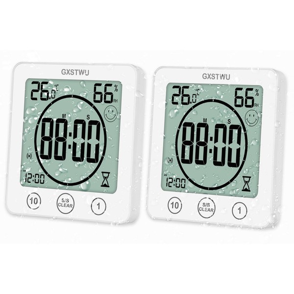 GXSTWU 2Pcs Digital Bathroom Clock Shower Timer with Alarm, Waterproof Clocks for Bathroom Kitchen Thermometer Hygrometer Wall Clock with Suction Cup Hanging Hole Magnet (2packs)