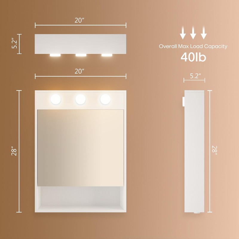 HAUSCHEN HOME 28x20 inch LED Medicine Cabinet Lighted Bathroom Mirror, Stepless Dimmable, 3000K/5500K Color Temperature Wall Mounted Makeup Mirror, Adjustable Shelf (White/Assembly Required)