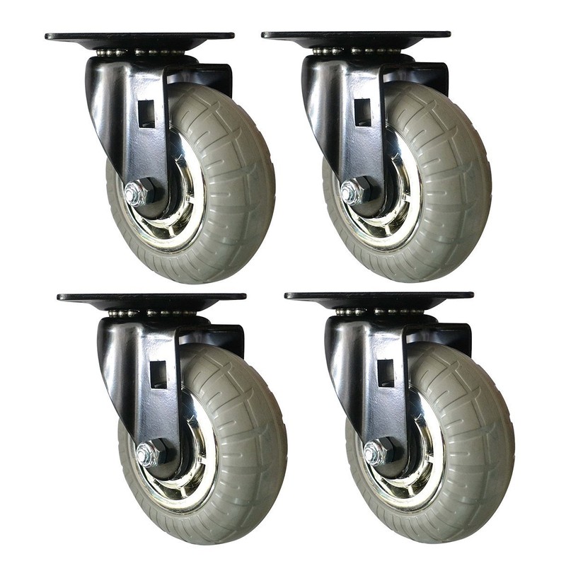 - 1-1/2-inch wide x 4-inch diameter soft foam rubber grey wheel with Chrome spokes and black double ball bearing swivel plate mount