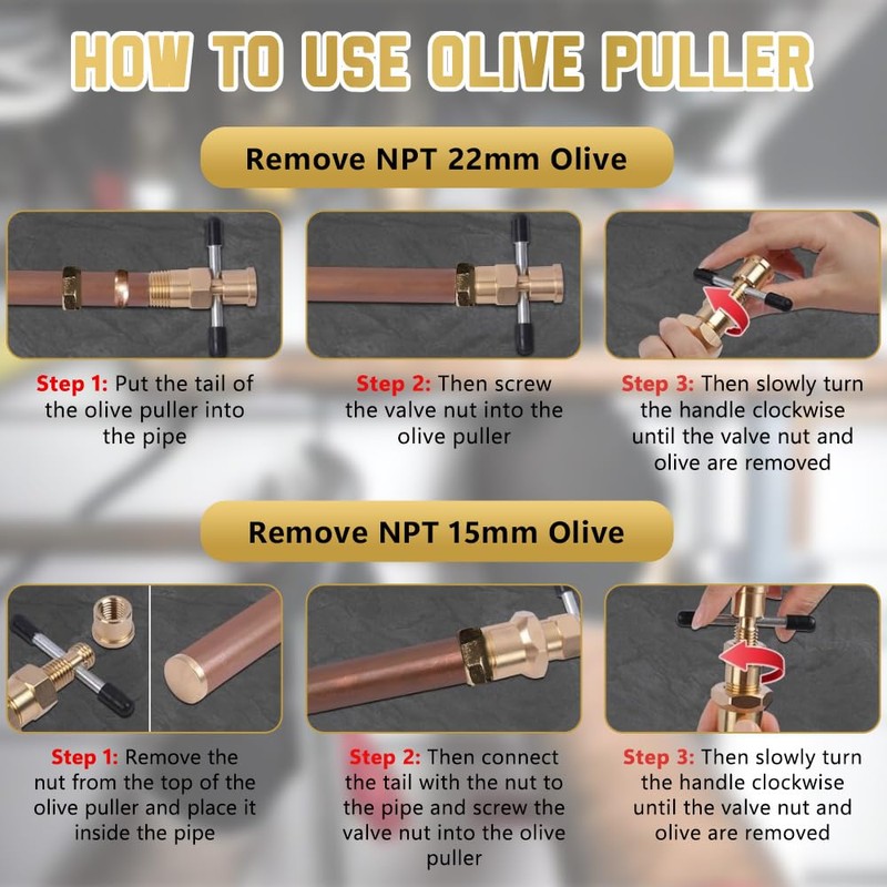 - 🧰【Ideal Removal Tools】: As the ideal olive removal tool, our olive removal tool is a must-have for any plumber or homeowner. It increases torque and makes it easier to remove brass nuts, ferrules (also called olives), stop valves, angle snap rings, compression fittings, and more. It provides a quick and reliable remedy for removing most olives. Whether you're performing routine maintenance or troubleshooting a plumbing issue, this tool ensures efficient and effective olive removal.
