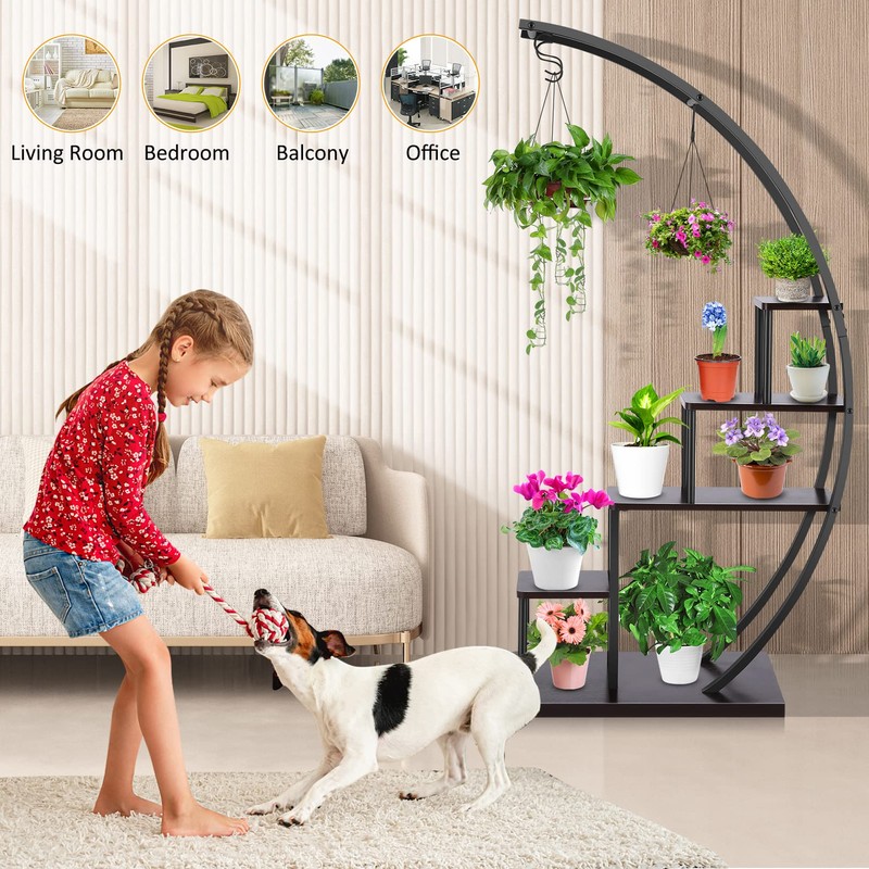 Homdox 5 Tier Metal Plant Stand Half Moon Plant Shelf Shape Ladder Flower Pot Stand Rack w/ Hanger & Anti-Toppling Device, Multi-Purpose Curved Plant Flower Display Holder Pot Rack for Home Patio Lawn