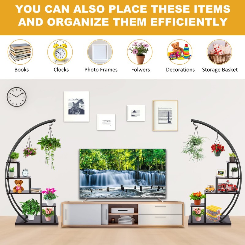 • 【Curved Design & Versatile Use】The tall plant stands indoor features a curved half moon shape which can maximum your space , making it a perfect addition to your living room, covered patio, balcony, bedroom, dining room, etc. ​Great for just about any room in your home.Excellent for displaying and organizing flowers, potted plants, books, photos, collectibles, or even small appliances.More than being a plant shelf, it also could be a bookshelf.