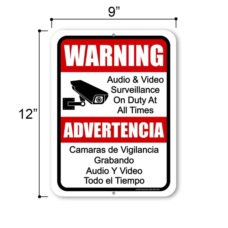 - Bilingual Message: Featuring the Honey Dew Gifts bilingual camera signs for property that is perfect for any home or business with surveillance security cameras! The message "Warning Audio & Video Surveillance On Duty At All Times Advertencia Camaras de Vigilancia Grabando Audio Y Video Todo El Tiempo" emphasizes the importance of safety for both English and Spanish speakers.