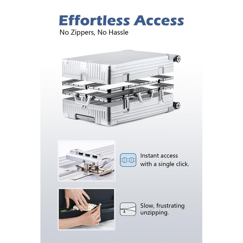 - ADVANCED ZIPPERLESS DESIGN: Our zipperless aluminum frame suitcase offers effortless access and enhanced protection. Secure latches replace traditional zippers, eliminating security concerns and stuck zippers. Perfect for travelers seeking peace of mind and convenience during their journeys.