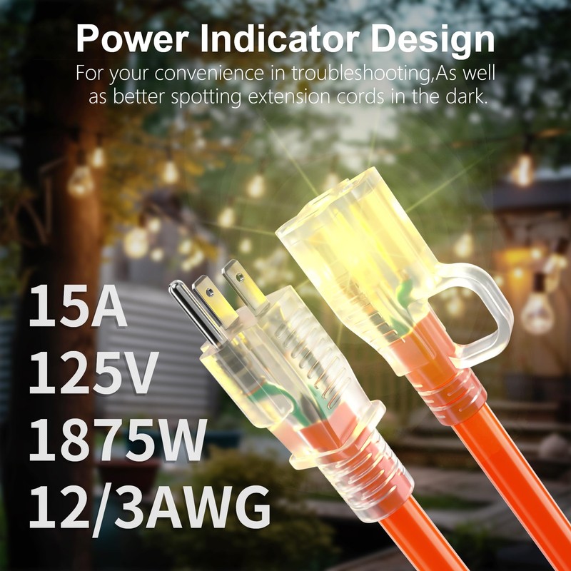 - Lighted End and Extra Size for Safety: The power socket indicator light shows that power is on and the heavy duty extension cord 150 ft is ready for work. Extra size Male NEMA 5-15P power plug and Female NEMA 5-15R power socket for safety. It is thicker and more durable than the normal type on market and has high insulation safety performance to prevent electric shock. ETL/cETL Listed for safe approval.