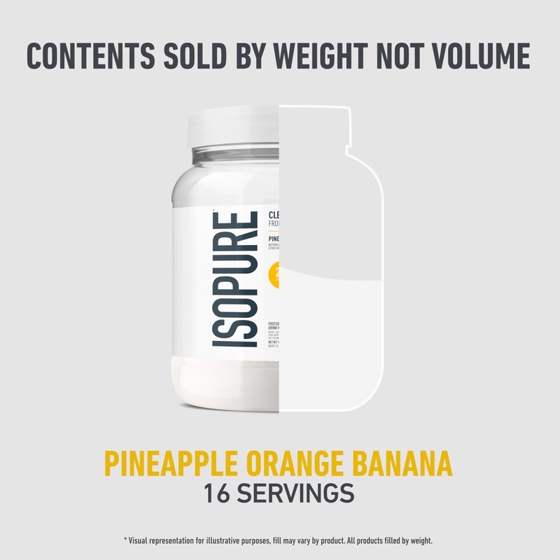 - One 14.1 oz bottle (16 servings) of Isopure 100% Pure Whey Isolate Protein Powder Infusions in dynamically delicious Pineapple Orange Banana flavor