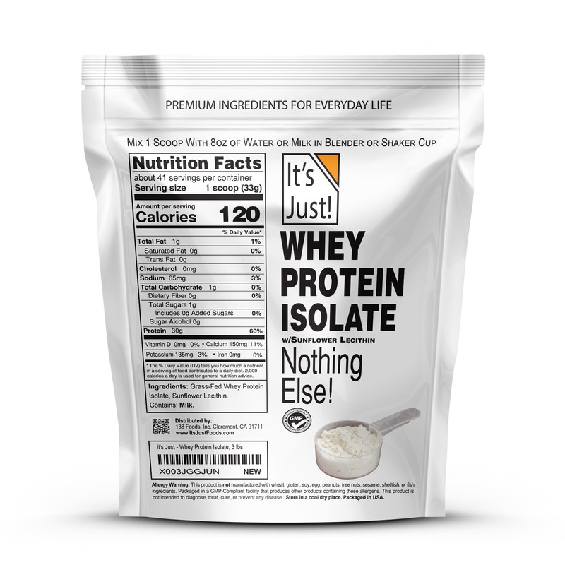It's Just! - Whey Protein Isolate, Ultra Premium Grass-Fed, Unflavored, Made in USA, Pure 90% Protein, Only 1g Carb, No Added Sugar (3 Pound)