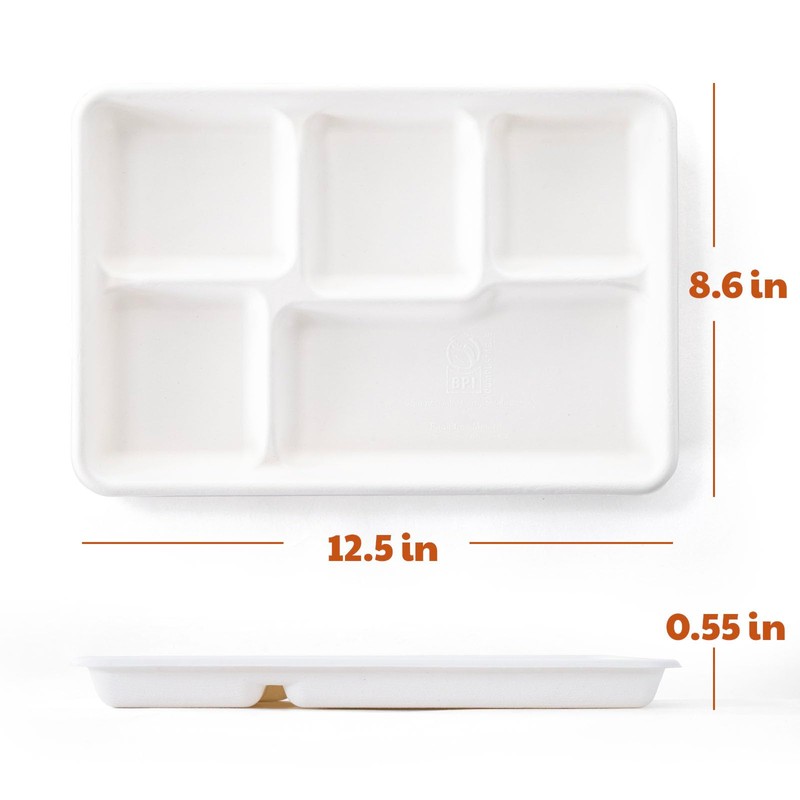 Joyborn Compostable 5-Compartment Paper Plates, 100 count, 12.5 x 8.6 inch, Disposable Divided Lunch Trays, Biodegradable Bagasse Sectional Plates for Buffet, Parties, Events & Daily Use, (White)
