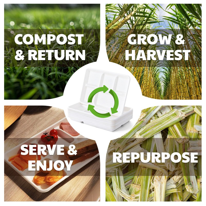 Tired of gravy running into your sweet potatoes? Try our compostable sectional plates! The divided design keeps flavors separate, preserving the true taste of each dish. Made from sugarcane fiber—a byproduct of sugar production—these plant-based plates are a fast-renewable resource. By turning waste into compostable plates, we protect forests and offer a greener alternative to traditional plastic or paper plates.