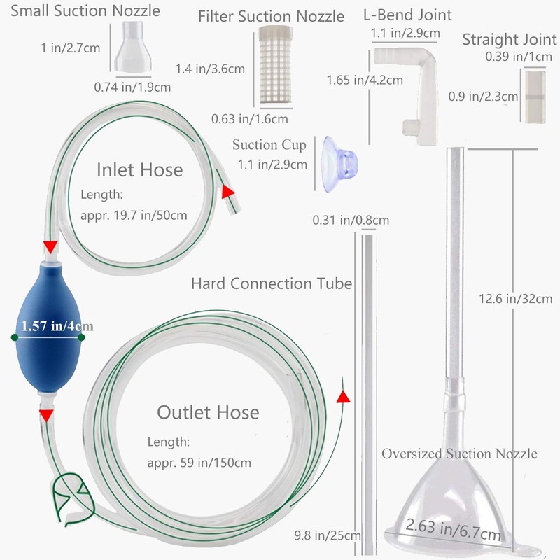 - Vacuum gravel cleaner kit, Including 1 small suction nozzle, 1 filter suction nozzle, 1 oversized suction nozzle, 3 straight joint,1 L-Bend Joint, 3 hard connection tube, 1 suction cup, 1 aquarium siphon with soft hose